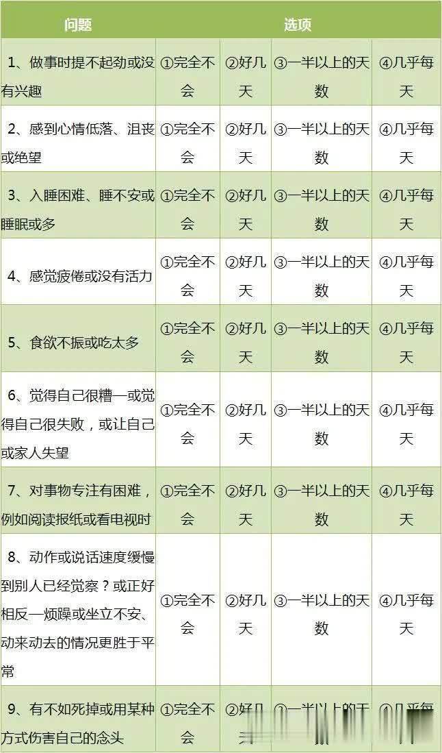 其中项目1、4是抑郁症的核心症状;项目9有自残意思。这三项超过2分以上需要重视。